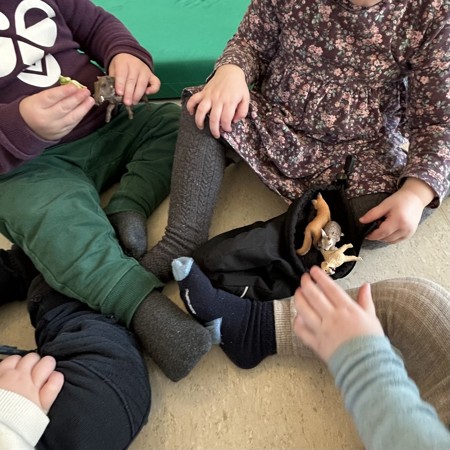 Vi har formidlet eventyret med konkreter, vi har dramatisert, vi har tegnet, malt, klippet, limt, funnet dyrene både ute og inne, vi har funnet votten på tur.